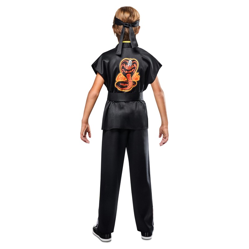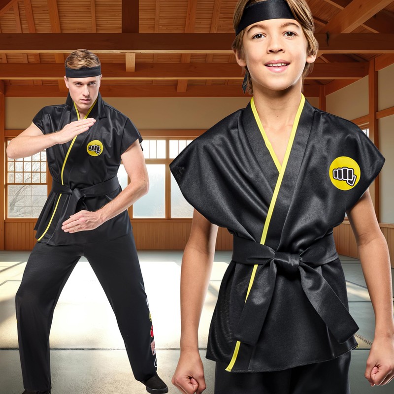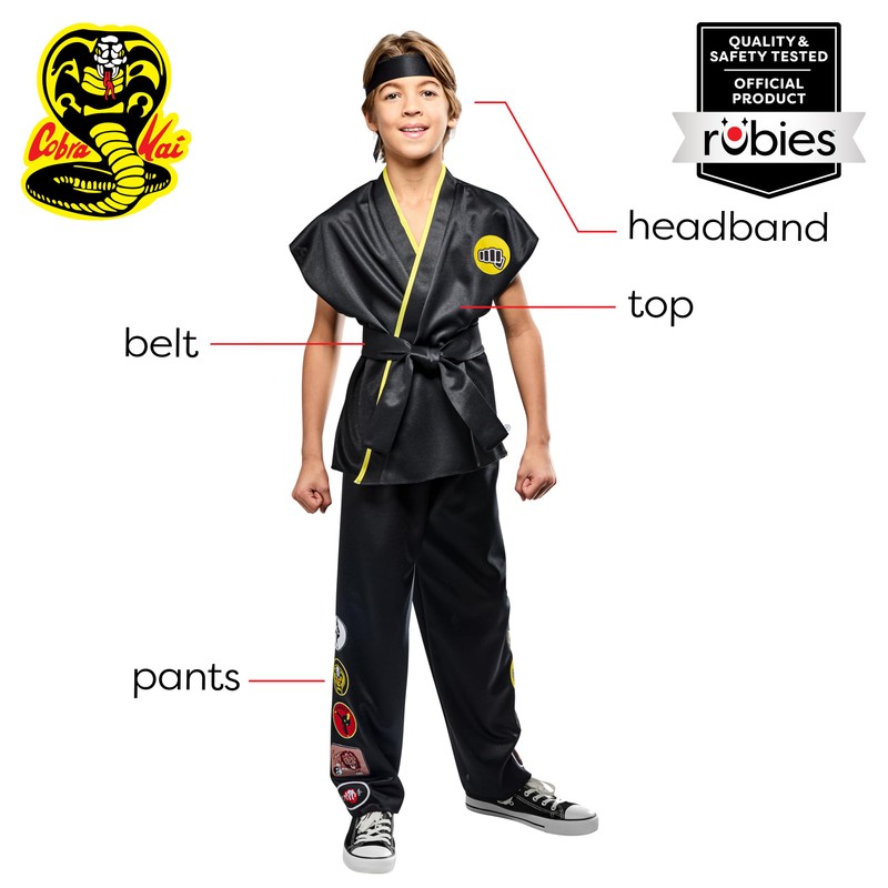 DescriptionOur Cobra Kai boys' costume is perfect for dress-up, cosplay, group costumes, everyday character play, theater stage costuming, Halloween parties, trick-or-treating, and more. This Halloween must-have costume is perfect for fans of the hit martial arts movie! Costume includes black karate pants and jacket with yellow detail and Cobra Kai patches on chest, back, and lower legs, plus black headband and belt. You're never too old to dress up for Halloween, whether you're revisiting an old favorite from childhood or trying something new. Look to Rubies for classic and licensed pieces for every costume occasion and season: Halloween, Christmas, Mardi Gras, Easter, and all occasions in between.
