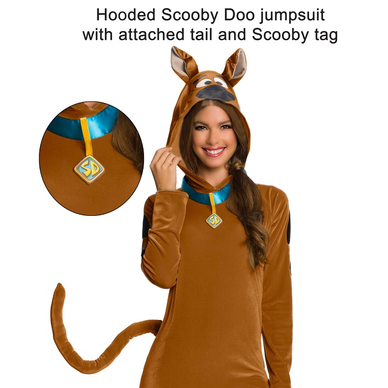 - Adult Women's Scooby Doo costume hooded jumpsuit with attached tail and blue collar neckline, hood features Scooby facial features and attached ears