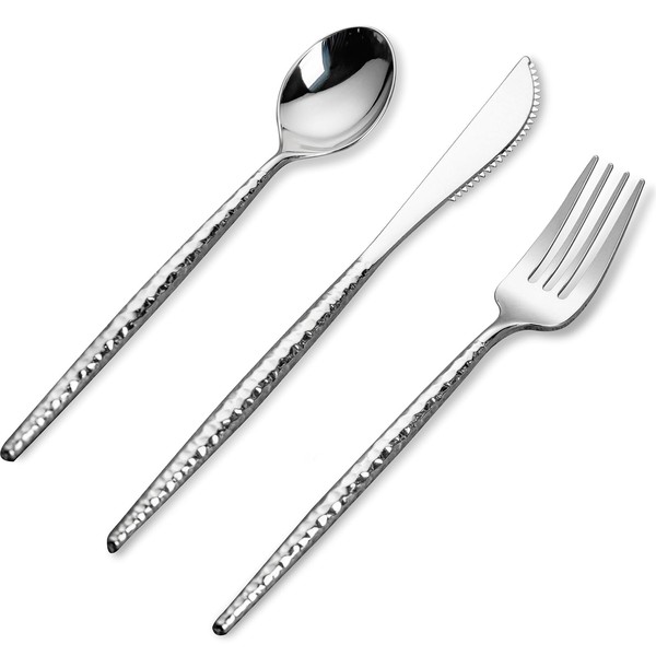 • Premium Material - hammer design: The heavy duty silver plastic silverware set is made of 100% food grade, BPA free and durable plastic. Designed with hammer patterns and shiny decent color so that ensures a safe and happy eating experience.
