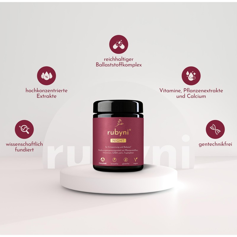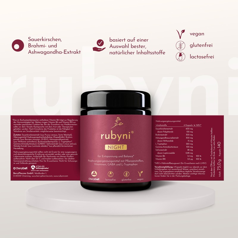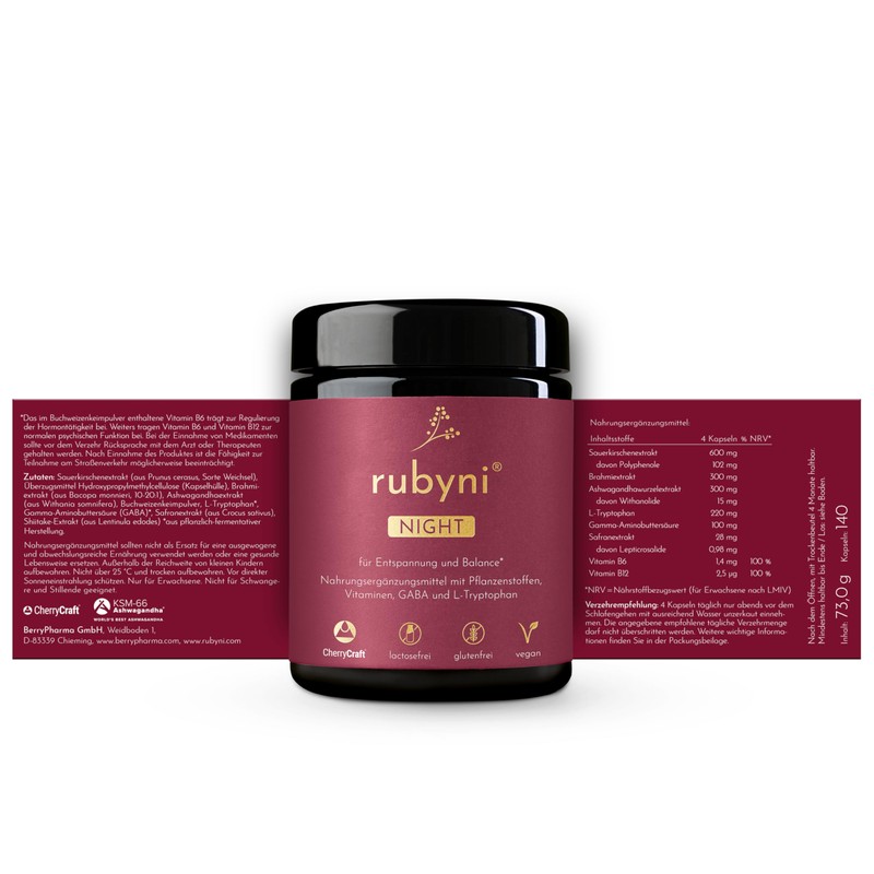 - HOCHWERTIGE PFLANZENSTOFFE OHNE ZUSÄTZE FÜR EINE RUHIGE NACHT – rubyni NIGHT vereint eine sorgfältig abgestimmte Mischung aus wertvollen pflanzlichen Extrakten der Sauerkirsche mit 102mg Polyphenole, Safran Extrakt, außerdem Brahmiextrakt und 300mg Ashwagandha-Extrakt sowie L-Tryptophan, GABA und Vitaminen. Die Rezeptur basiert auf traditionellen Inhaltsstoffen und modernen Nährstoffen für eine bewusste Ernährung und eine entspannte und ausgeglichene Stimmung.