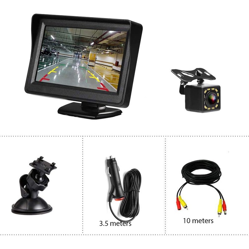 - 【Rückfahrkamera-Kit】: 4,3-Zoll-HD-Monitor + 12 LED-Rückfahrkameras mit Nachtsichtfunktion + 10-M-AV-Kabel mit 3,5-M-Adapter + 2* Ständer. Mit der Nachtsichtfunktion der Kamera können Sie Bilder nachts klar und bequem anzeigen Nachtumkehr.