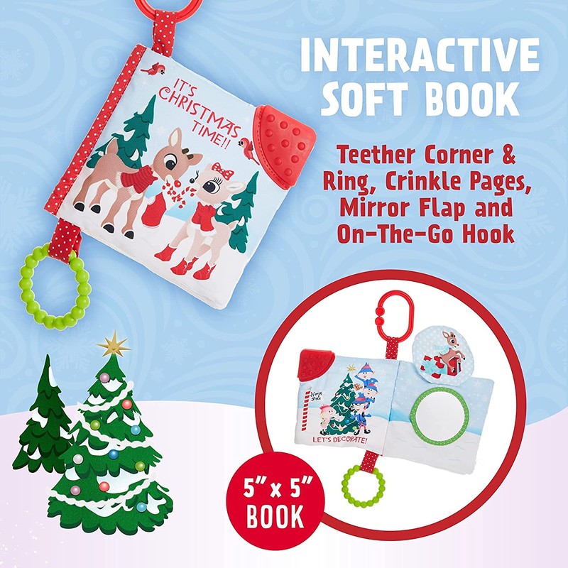 - Sensory features entertain baby and encourage hands-on learning with textured materials, crinkle and rattle! Begin story time with a soft fabric book to hold which engages your little ones senses, then read aloud from the hardcover to engage your little ones mind. The soft book engages tactile learning with two textured teethers and a clip for attaching to stroller or car seat, and mirror. Prepare for squeals of delight when Rudolph appears!