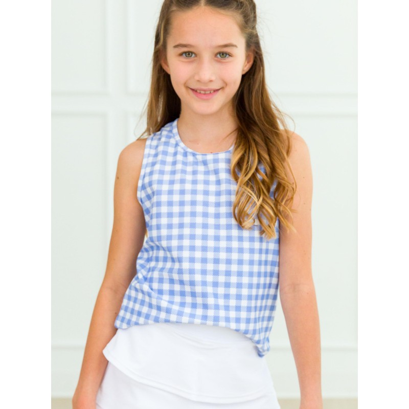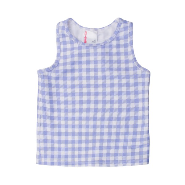 RuffleButts Girls UPF50+ Sun Protected Athletic Active Stretch Tank Top - Periwinkle Blue Gingham, 3T