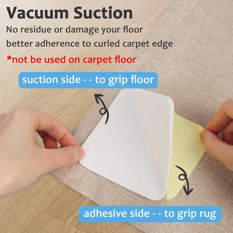 - EASY TO INSTALL AND REMOVE: The rug pad grippers are made with unique vacuum technology, simply peel off the adhesive backing sticker and stick the carpet clips to your carpet, they can be easily peeled off your floor when needed without damaging your floor.
