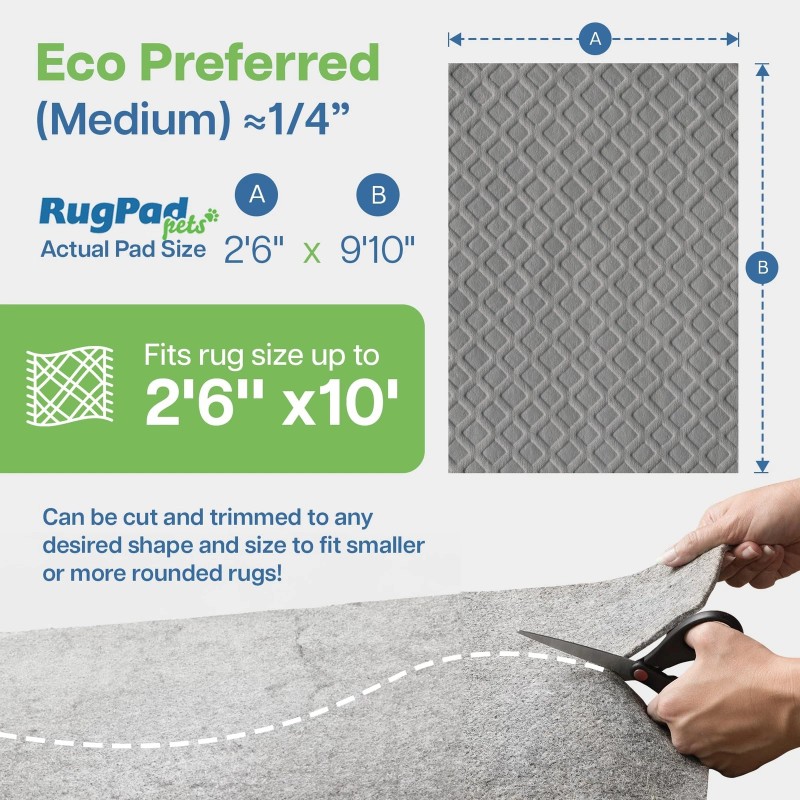 - PERFECT FIT FOR ANY ROOM Designed for versatility, this 1/4" medium rug pad in a 2'6''x10' size is slightly smaller 2" to ensure a seamless fit under most rugs, including entryway and runner rugs. It offers pet-friendly rug floor protection against scratches and wear while doubling as a non-slip gripper for both rug-to-floor and carpet-to-carpet applications. Plus, the pad can be easily cut or trimmed to any custom shape or size, making it ideal for smaller or uniquely shaped rugs.
