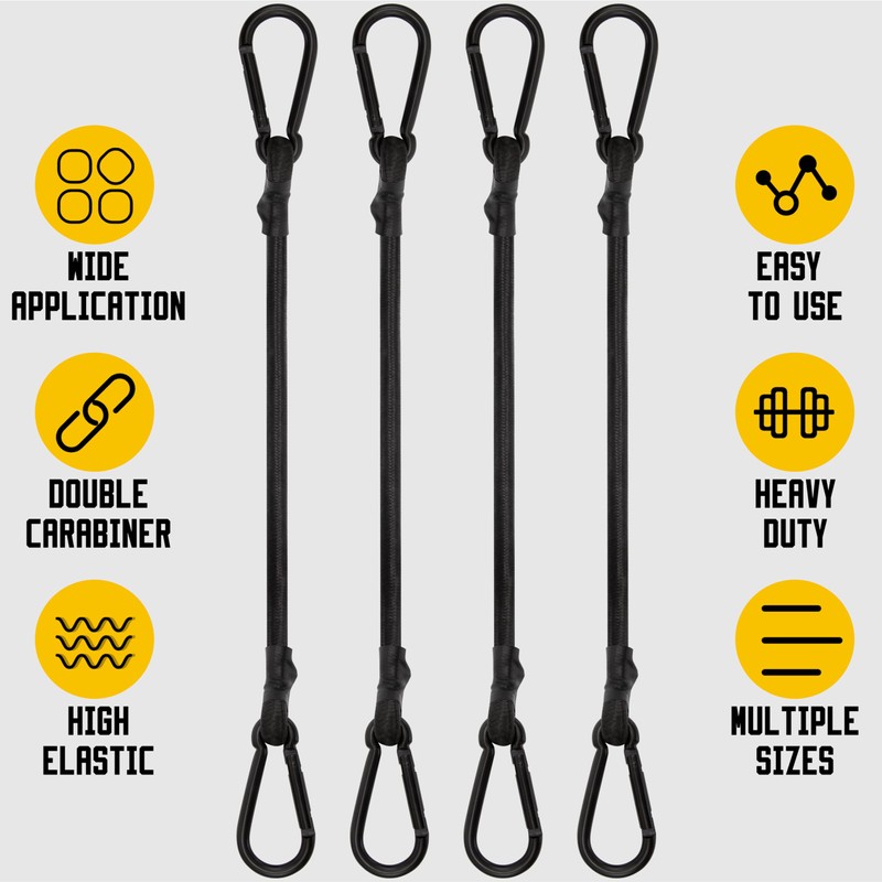 - Heavy duty tie fown dtraps with Carabiner Designed for: 4 Piece Tie Strap Sets for Bike, Outdoor, Indoor, Laundry, Car, Tent Pole, Luggage, Roof Rack, Trailer, Canoeing, Kayaking Boats, super elastic straps with metal Carabiner provide enough length and strength to hold bulky luggage to secure cars, bikes and motorcycles. Bungee cords provide enough length and strength to secure bulky luggage on trolleys, bicycles and motorcycles.