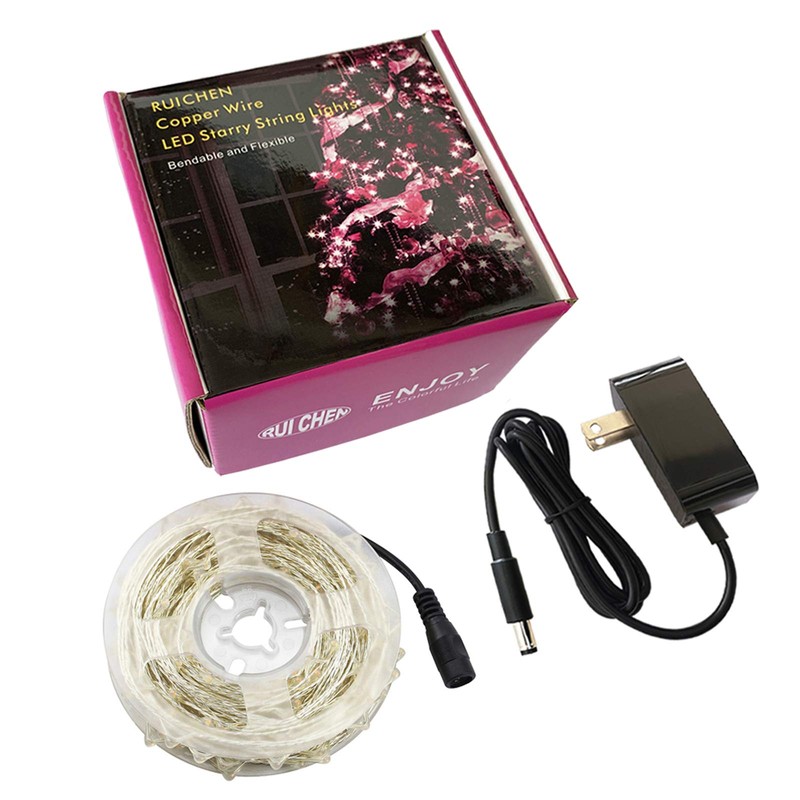 **Decorate your home with RUICHEN fairy lights, enjoy the colorful life.** You can use this beautiful Starry String Lights for ambiance decoration and atmosphere creating, like decorating your garden, yard, corridor, patio, party, festival, Christmas tree, Thanksgiving, etc. Just do it yourself and use it to make different beauties in kinds of contours. **Features:** 1, Perfect for creating harmonious and romantic atmosphere for your home. The copper wire is flexible, you can bend it to any shape or wrapped it on anything you want like wreaths, trees, plant, flowers, weddings decor. Widely used for your patio, deck, front porch, room, kitchen, garden and so on. They are waterproof, small and portable. 2, Plug and play, no need to spend money to buy batteries, just plug in power supply source, energy save! **Specifications:** String Length: 99ft/30m Adapter cable length: 5ft/1.5m LED Quantity: 300 LEDs Lamp Spacing: 3.94in/10cm Power Adapter Input: AC100-240V 50/60Hz Power Adapter Output: DC 12V Wire Material: Copper Wire Wire Color: Silvery Working Temperature: -25~60â **NOTES:** 1\. Do not apply excessive force or repetitively bend the same spot. 2\. The power adapter is not waterproof, please protect it when you use the lights outside. **Package Includes:** 1 x 99ft 300LEDs String Lights with Spool 1 x UL&FCC-listed Power Adapter