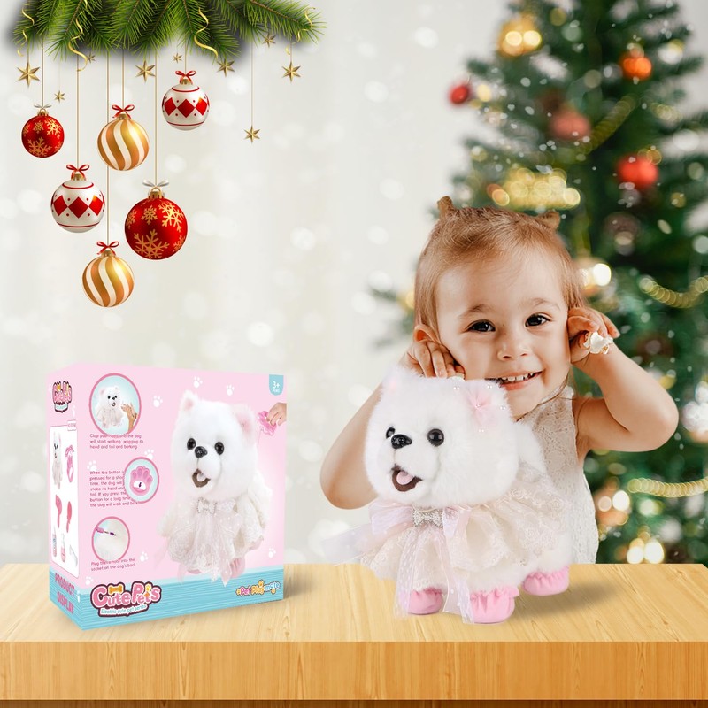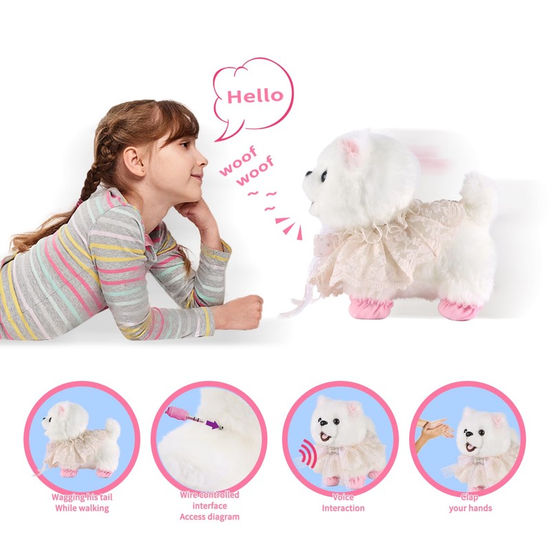 - The best thing about this dog toy is that it comes with a remote control leash, so children can pretend to walk their pet. The button on the lead is easy for children to use. The dog puppy can bark, wag its tail and run for a short time, the puppy barks and runs, wags its tail and nods its head all the time, it looks super cute.