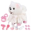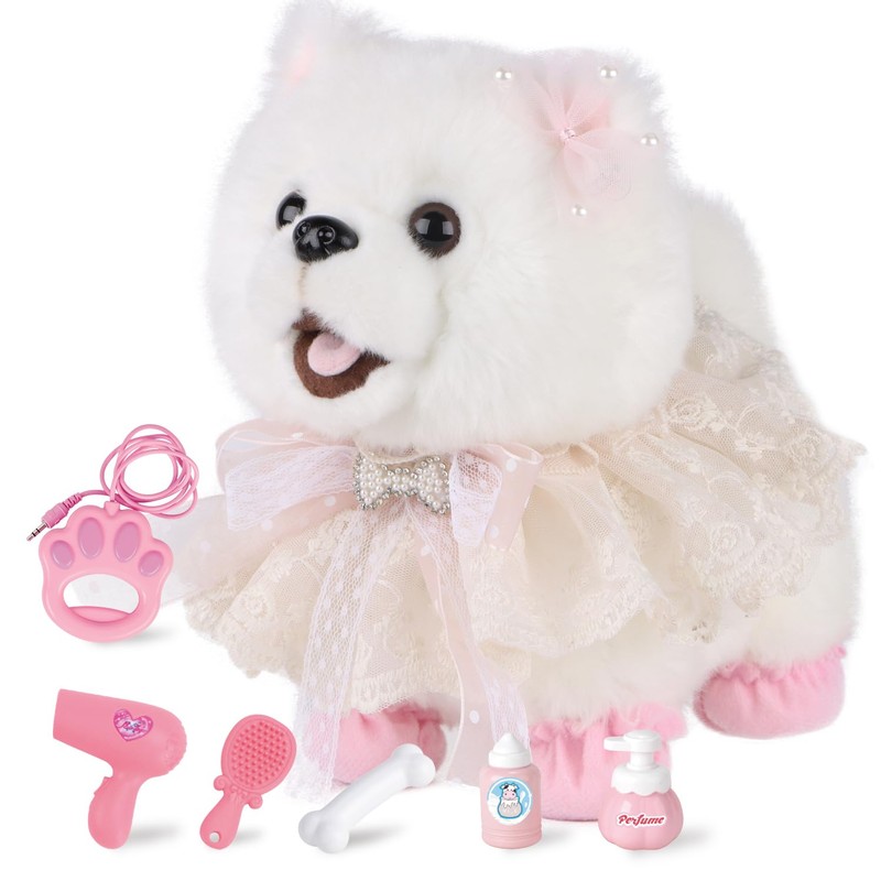 - The toy dog is cuddly and cute and has the cutest fur like a real dog would have. Soft and fluffy touch puppy dog, your daughter or son is able to brush the fur with the comb, the fur does not shedding. When she is not busy walking or brushing him with him, it is also soft enough to cuddle with him!