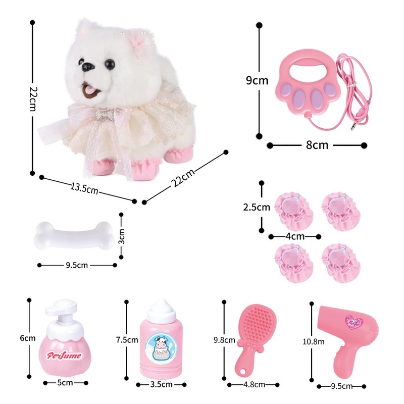 - It comes in a beautiful large gift box with a dog and all accessories that includes a bone, remote control leash, brush, perfume, hair dryer, milk bottle and cloth. Instruction So this toy can teach her how to take care of a puppy before taking the step to actually buy one.