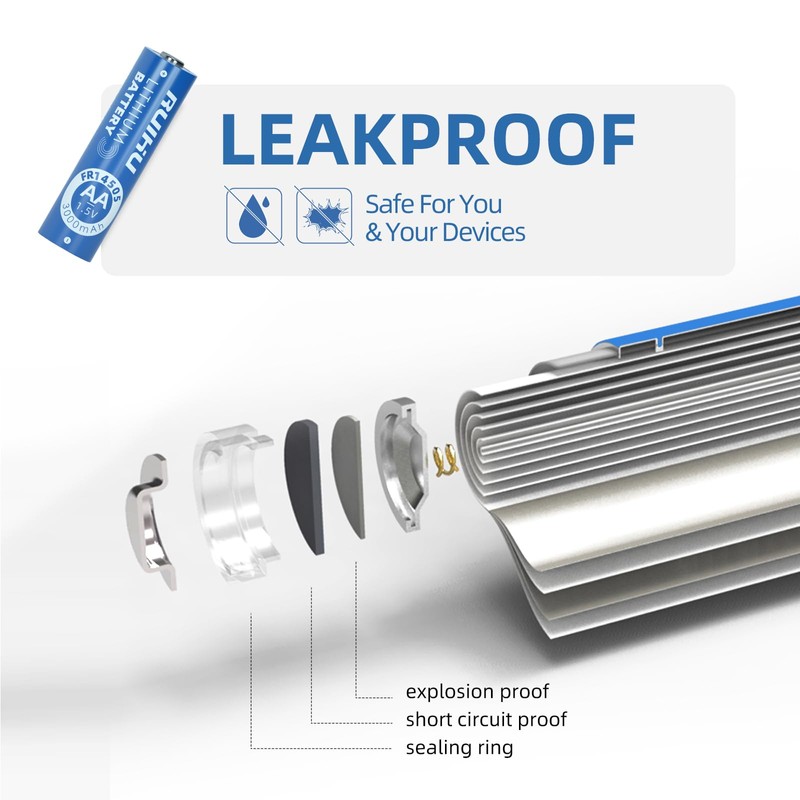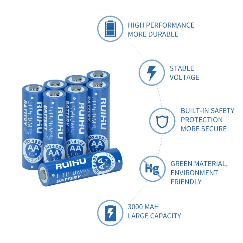 - đăSuper Innovative BatteyăRUIHU AA lithium batteries adopts new technology and unique Li-FeS2 material to keep the battery super long-lasting. The batteries show no memory effects and keep 1.5v constant discharge in 3000mah lithium cell.