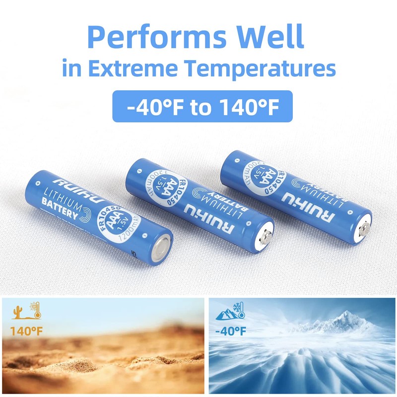 - đăAdapt to extreme temperaturesăWorks perfectly in extreme environments from -40â to 140â. Its cold resistance surpasses alkaline batteries and Ni-MH batteries, and is suitable for both outdoor and indoor use.