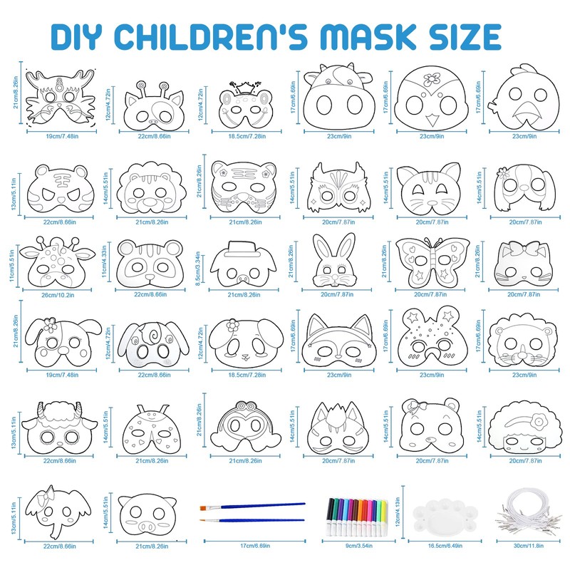 - Creative masks for painting craft set children: We offer you 32 blank masks for colouring in different styles, 32 elastic cords, 2 pieces painting brushes, 12 watercolour paints in different colours, 2 beautiful palettes, a rich set for all your painting needs. The colourful animal cards can provide inspiration for your DIY creations.