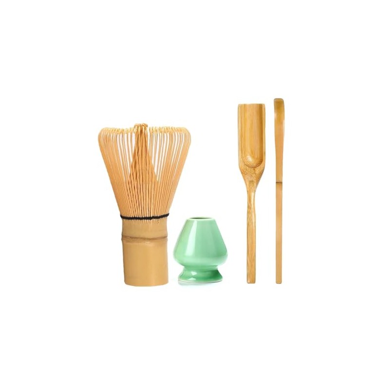 - A three-piece matcha tea set, including a bamboo stirrer, a traditional tea spoon, and a ceramic stirrer holder.