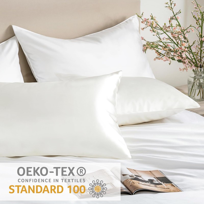 RUIKASI Satin Cushion Cover 40 x 80 cm White - Set of 2 Soft Pillowcase White Like Silk Pillowcase 40 x 80 cm for Hair and Skin with 2 Hair Bobbles Better Care Than Silk Pillow Case Pillow Cover