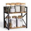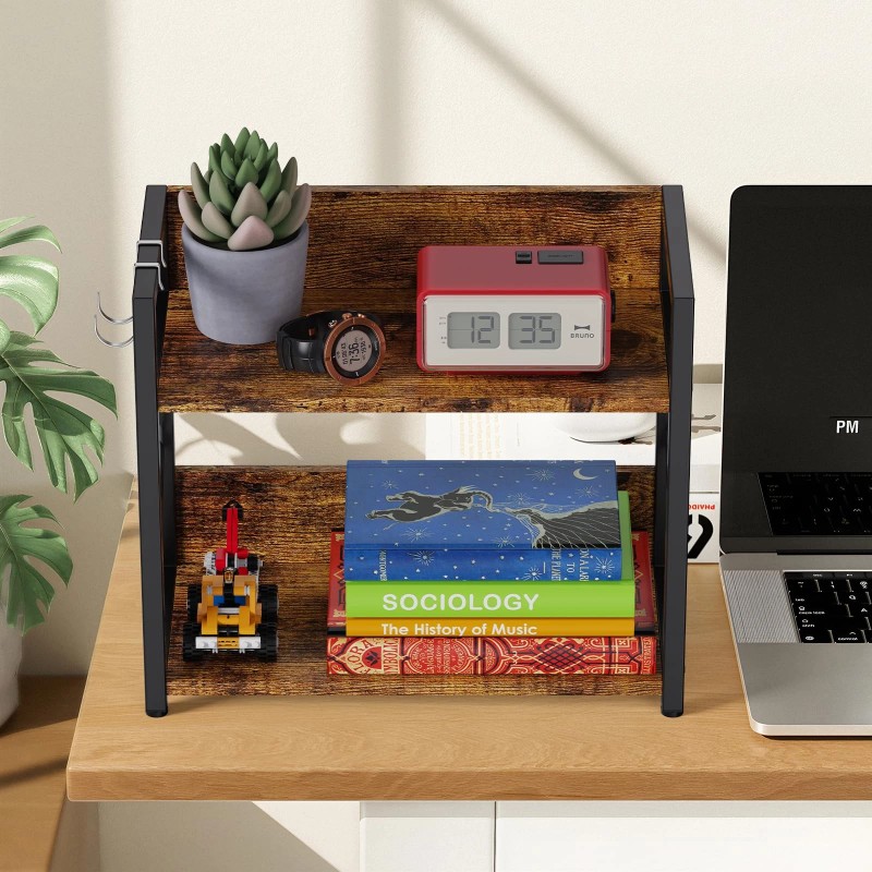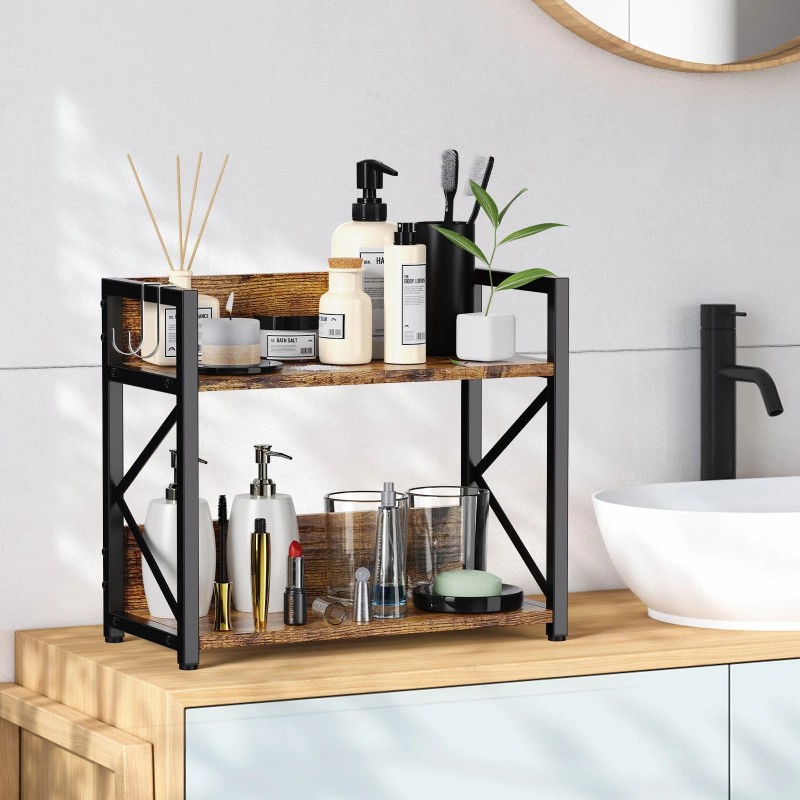 Multifunctional Countertop Organizer:2 tier counter shelf rack can be used in different places,such as living room, bathroom, bar counter, kitchen, and office desktop. Wooden desk shelf can organize coffee accessories, tea bags, snacks, office supplies, makeup,spice jars,and small plants etc.