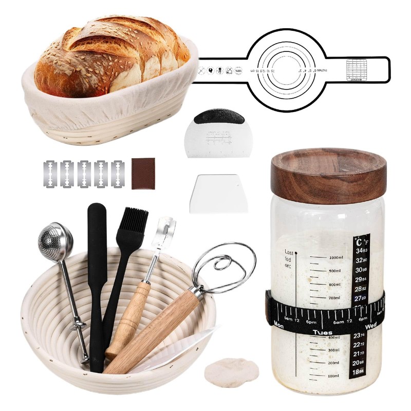 - Complete Sourdough Bread Baking Kit---The kit includes 40 oz glass sourdough jar,thermometer band,tracker band,9”round and 10”oval banneton bread proofing baskets,silicon scraper,dough scraper,plastic scraper,dough whisk,basting brush,flour duster,bread lame,silicone baking mat.