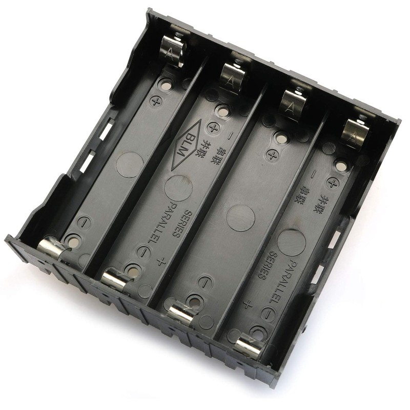 - El paquete incluye: 4 cajas de almacenamiento de batería 18650, 4 ranuras con pin