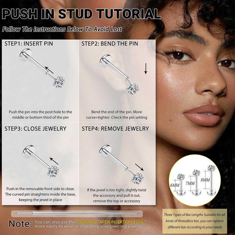 4.Perfekte Passform durch einheitlichen Stab: Alle Push-in Köpfe passen auf denselben Stab (Größe: 20G / 0,8mm). Mit unterschiedlichen Längen (6–8 mm) und Kopfgrößen (2–4 mm) finden Sie immer die richtige Kombination für Ihr Piercing.