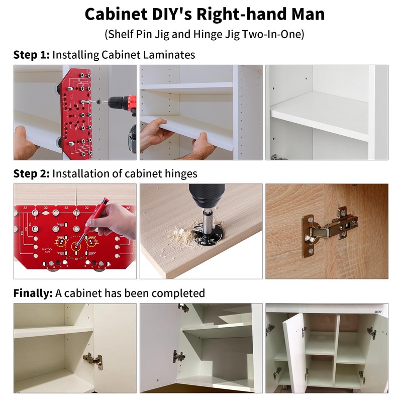 - -in-: This tool is a combination of shelf pin jig and hinge jig functions. One tool can help you finish the whole cabinet DIY.