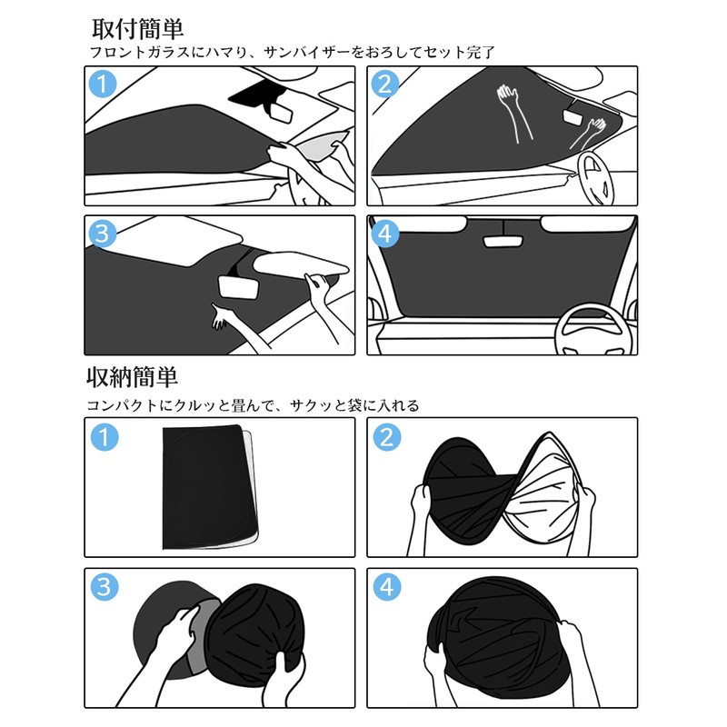 - High Quality 4-Layer Construction, Long Lasting: Made of high quality material, 4-layer construction, aluminum plating, and thick non-woven polypropylene fabric. The wire type allows for compact storage. 1. The front side is a high quality blackout sheet with aluminum plating. ② UV protection, special layer of nano reflection 3. Special layer of heat and combustion resistant. 4. The back is a polyurethane black thermal sheet