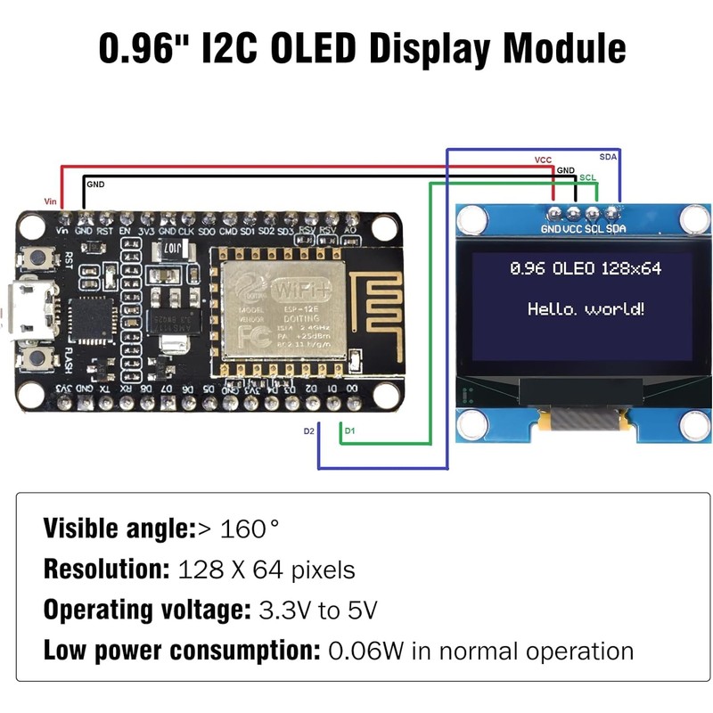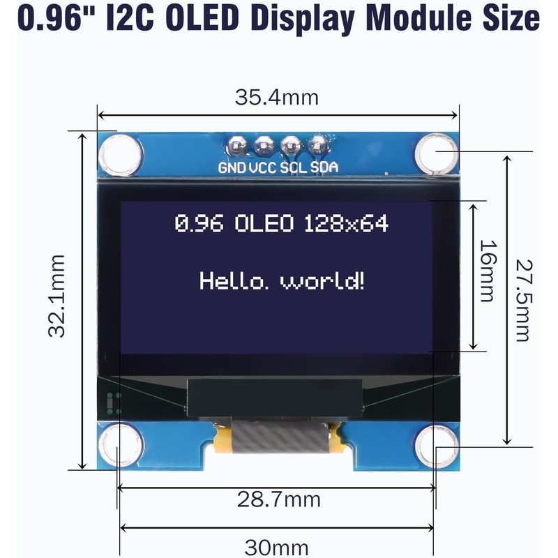 - 1. "Dimension" 0.96"; Resolution: 128*64; Power Voltage: 3.3V-5V; Display Controller: SSD1315