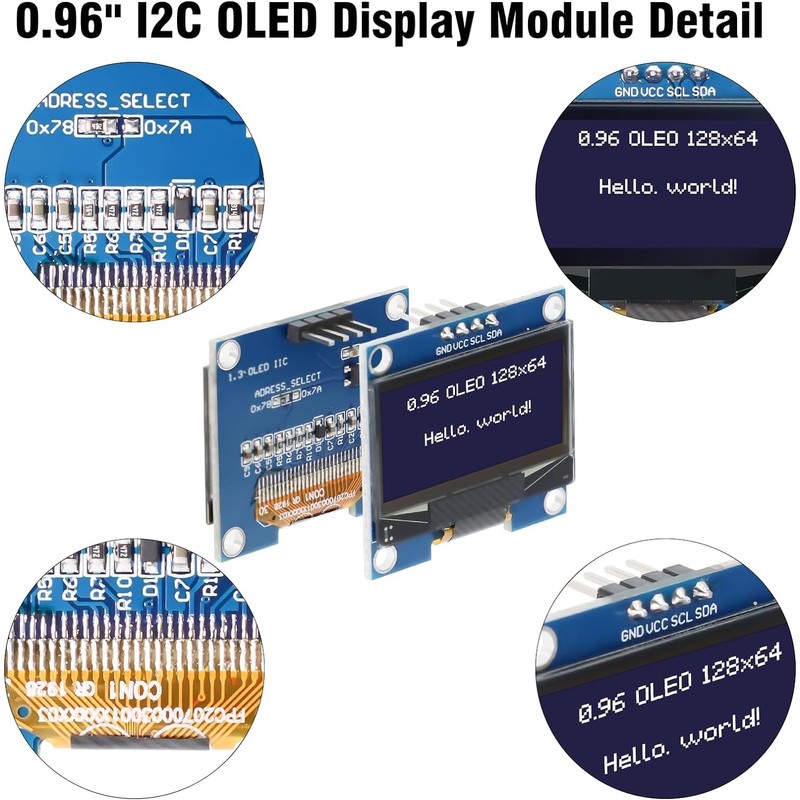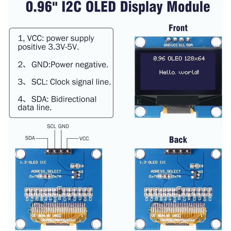 - 5. Communication Method: Only two IIC, I/O ports are "Light back" and OLED light does not require light backing. I2C address can be changed: when connected to 0x78, it will be 0x3C; connect 0x7A, it will be 0x3D
