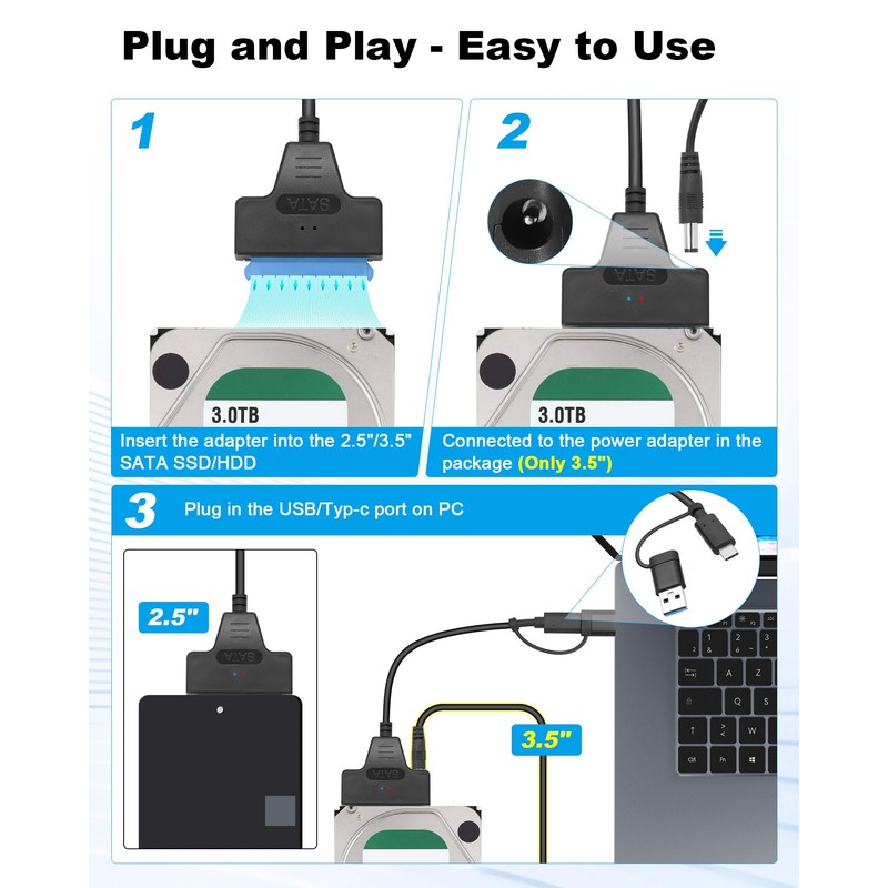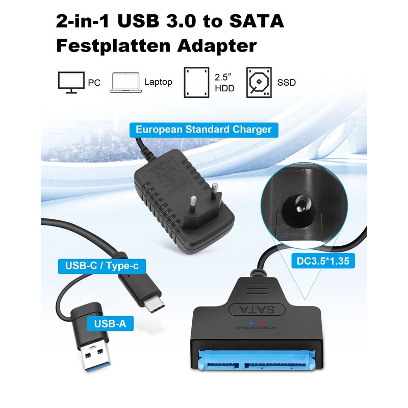 - Schnellzugriff SATA SSD/HDD: Der Adapter ist mit 2,5"/3,5“ SATA SSD/HDD, kompatibel und eignet sich perfekt für mobile Speicherlösungen. Bei der Verwendung von 2,5„-HDDs ist keine externe Stromversorgung erforderlich, und der mitgelieferte 12V 2A-Netzadapter unterstützt 3,5“-Hochleistungs-HDDs für eine Vielzahl von Nutzungsszenarien.