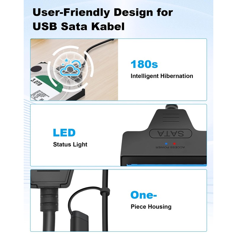 - Der Adapter ist mit einer LED-Anzeige ausgestattet, die den Arbeitsstatus in Echtzeit anzeigt und so für Ruhe sorgt. Egal, ob es um die Übertragung von Dateien, die Sicherung von Daten oder die Erweiterung des Speicherplatzes geht, alles ist einfach zu bewerkstelligen und somit ideal für effiziente Büroarbeit und Unterhaltung.