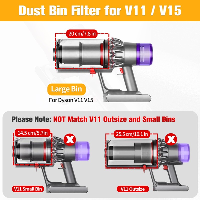 - ?? Paket Kit Enth?lt: 1 * V11 V15 Staubbeh?lter Teil und 1 * Filter f??r Dyosn V11 V15 . Es ist sehr einfach, den V11 V15 Beh?lter zubeh?r und den Filter zu ersetzen. Sie k?nnen die Beh?lter von Staubbeh?ltern in wenigen Sekunden ohne zus?tzliche Werkzeuge ersetzen.