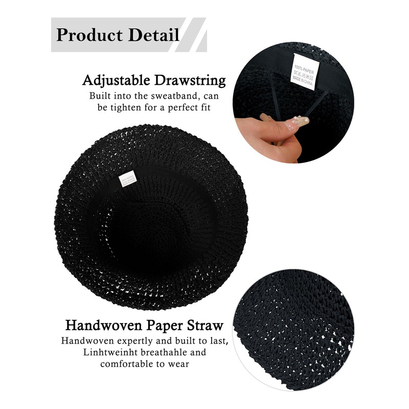 Rulala Fancy Womens Sun Hat Handmade Straw Bucket UV Protection Wide Brim Packable Travel Beach Cap for Summer UPF 50+(Black)