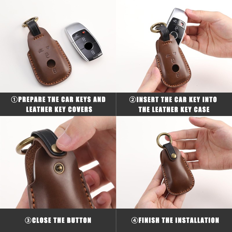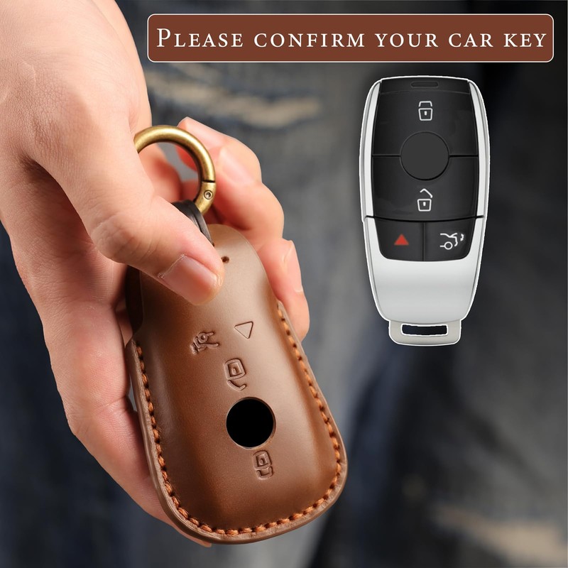 Rulansda for Mercedes Key fob cover. compatible with Benz E-Class, C-Class, S-Class, GLE-Class, GLS-Class, CLS-Class, CLA-Class, AMG 4 Button Smart Leather Car Key Protector Key Case Fob Chain / Brown
