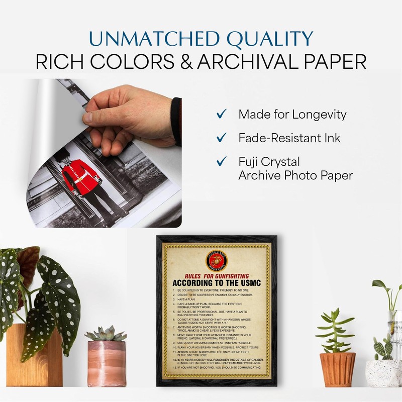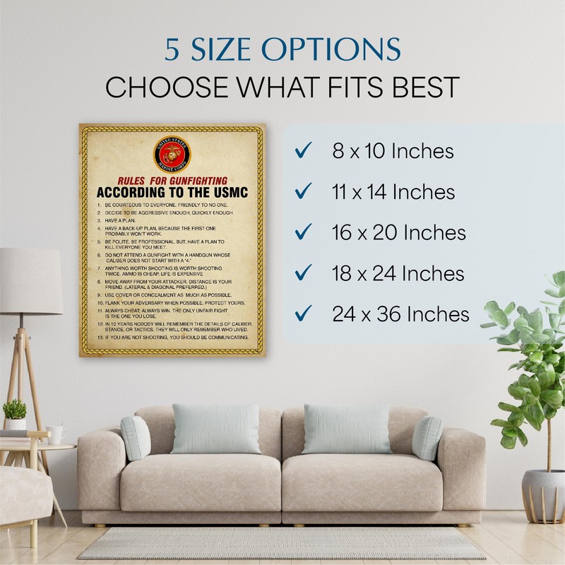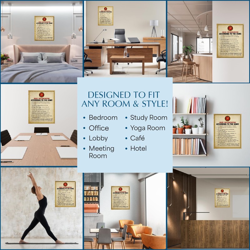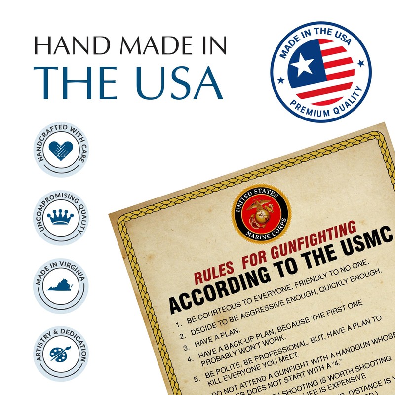 - Patriotic Wall Art Poster: Showcase your American pride with this USMC wall decor featuring the iconic rules of gun fighting. This piece enhances military offices, home spaces, and adds a patriotic touch to any occasion.