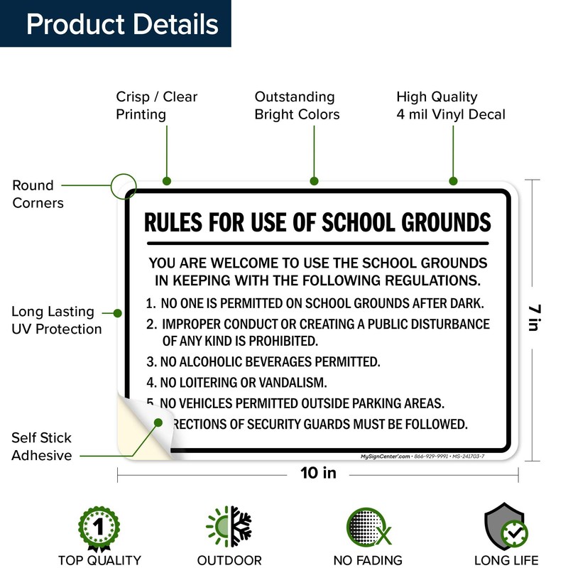 Rules For Use Of School Ground You Are Welcome To Use School Grounds Sign, 10x7 Inches, 4 Mil Vinyl Decal Stickers Weather Resistant, Made in USA by My Sign Center