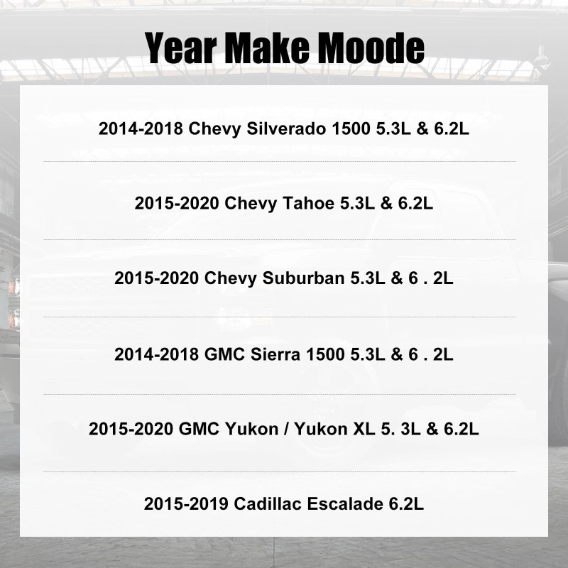 [Product Introduction] Enhance the performance and longevity of your engine with a compatible fit for various Chevy, GMC, and Cadillac models.Compatible with 2014-2018 Chevy Silverado 1500 5.3L & 6.2L, 2015-2020 Chevy Tahoe 5.3L & 6.2L, 2015-2020 Chevy Suburban 5.3L & 6.2L, 2014-2018 GMC Sierra 1500 5.3L & 6.2L, 2015-2020 GMC Yukon/Yukon XL 5.3L & 6.2L, 2015-2019 Cadillac Escalade 6.2L.