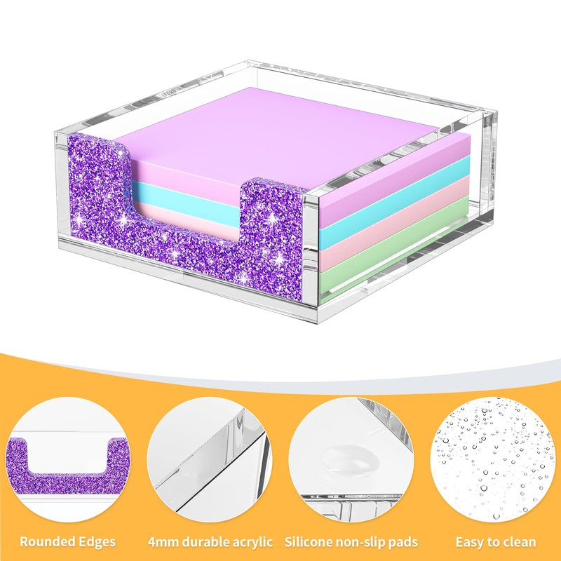 Rulyyo Acrylic Notepad Dispenser Organizer - 3 x 3 in Clear and Glitter Purple Sticky Note Holder W/O Pads Memo Holder for Dorm Room School Classroom Office Desk Organizer Aesthetic Supplies