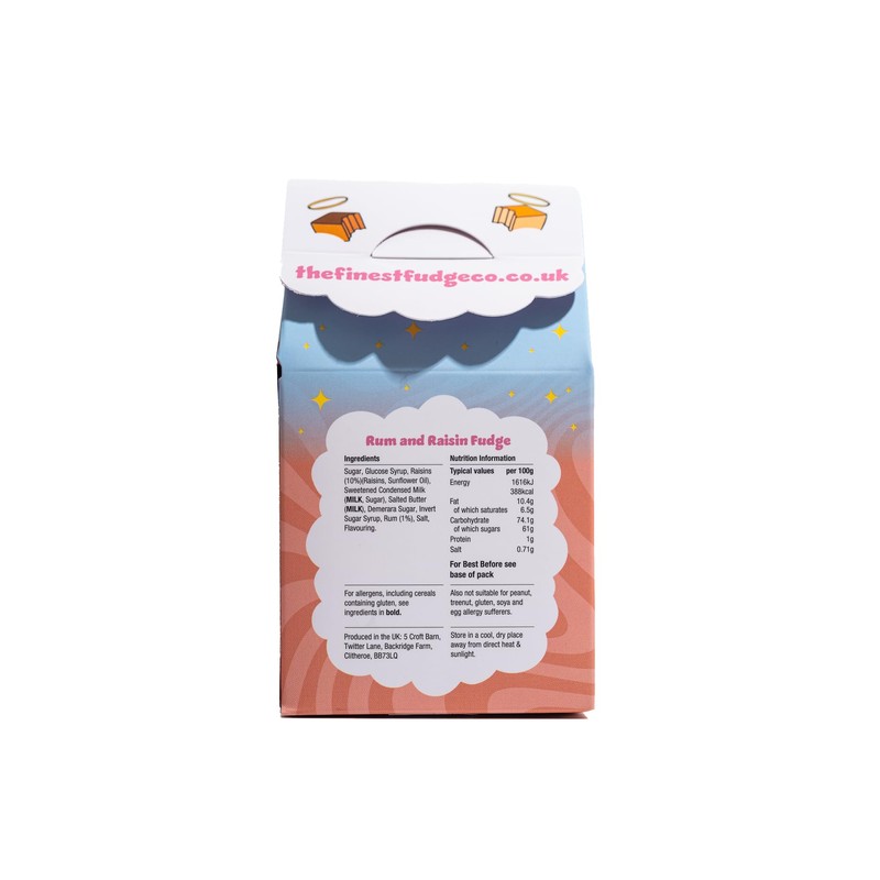 - Classic Indulgence – A rich, creamy fudge infused with the warm, indulgent flavours of rum and juicy raisins for a timeless treat.