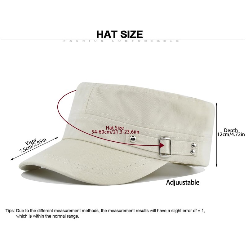 - Size: Cadet army cap Circumstance: 54~60cm/21.3~23.6"; Brim Width: 7.5cm/2.95", The height of cap: 12cm/4.75", please allow a little differences on sizes due to manual measurements