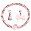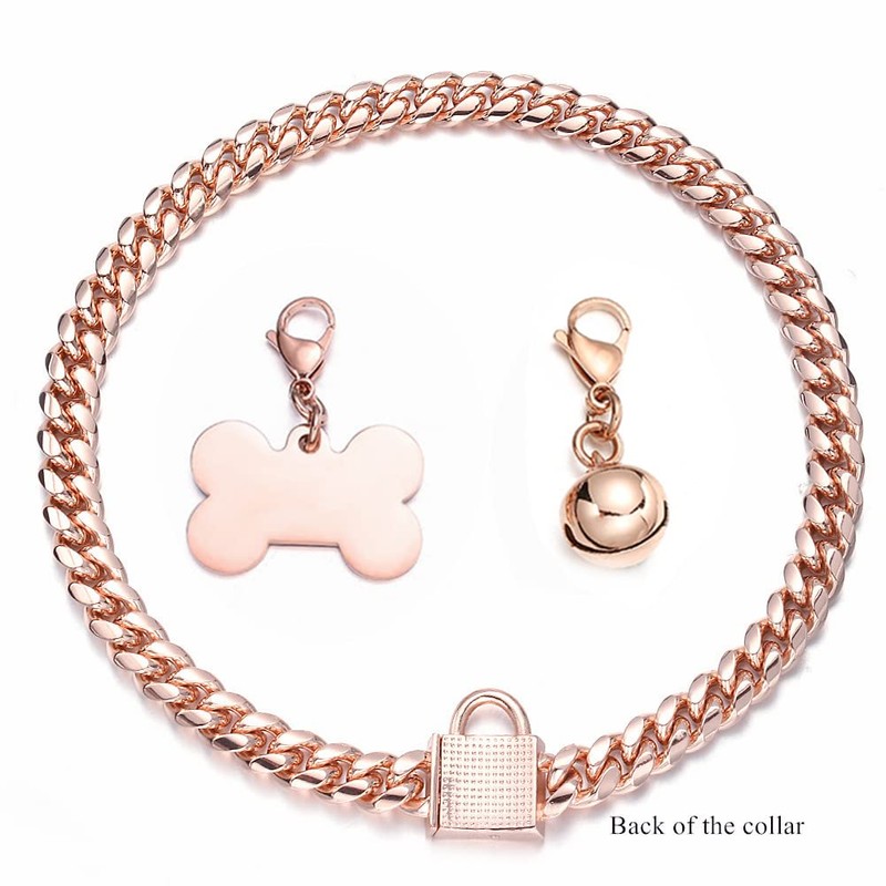 - Material: Harmless and Durable. All collars are made of rose gold plated 316l stainless steel which is sturdy,durable,nickel free,lead free and chew proof.Designers used luxury 5A CZ lock to connect the chains and hang one bell,one dog ID tag on the lock.Dog ID tags are chew proof,you can use them for a long time.The bells sound crisp,that attracts dogs' attention.About the lock,inlaid rows of cubic zirconia,not easy to drop,press to unlock,bling and shinny.