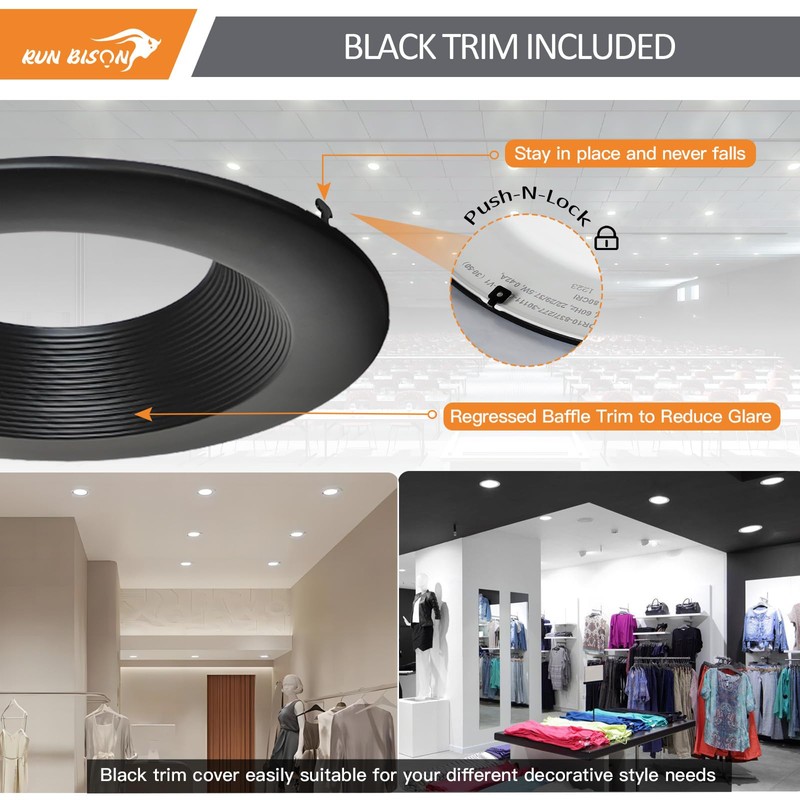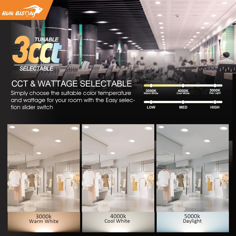 - 【3CCT Adjusrable】The Run Bison 10 inch LED commercial downlight provides 3 color temperatures of 3000K warm white, 4000K cool white or 5000K daylight for selection, you can choose the most suitable light for retail spaces, school, library, hospital, office, airport and other areas according to your preferences components.