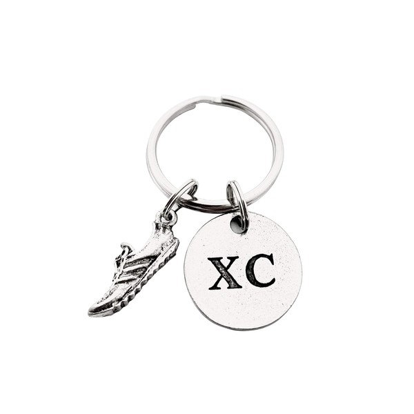 • RUN XC Round Pewter PENDANT Key Chain / Bag Tag features a Pewter 3 dimensional Running Shoe Charm measuring 3/4 inch long plus a 7/8 inch Round Pewter XC Pendant on Round Stainless Steel Key Ring