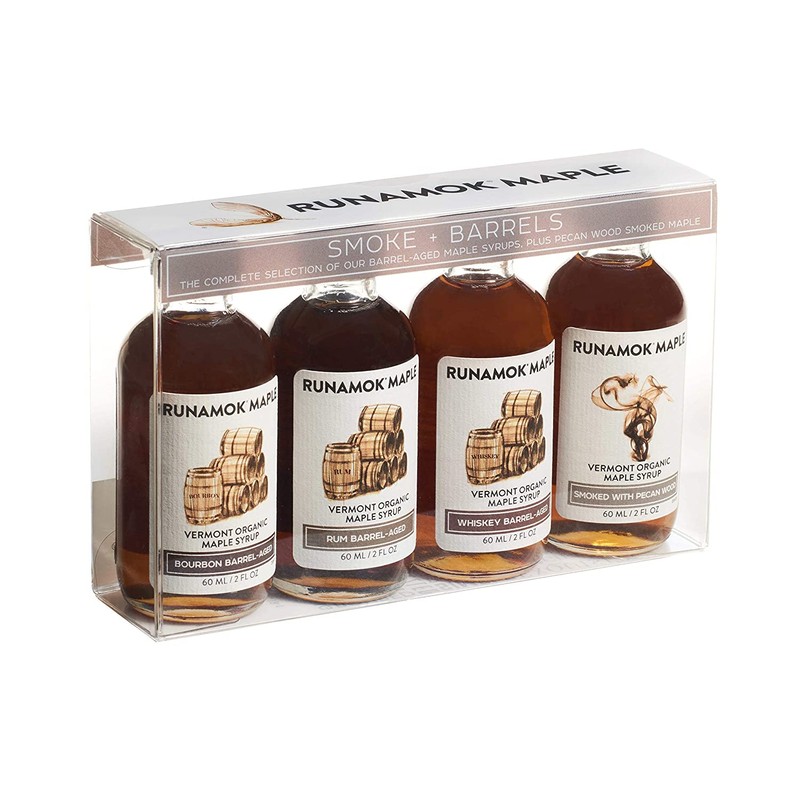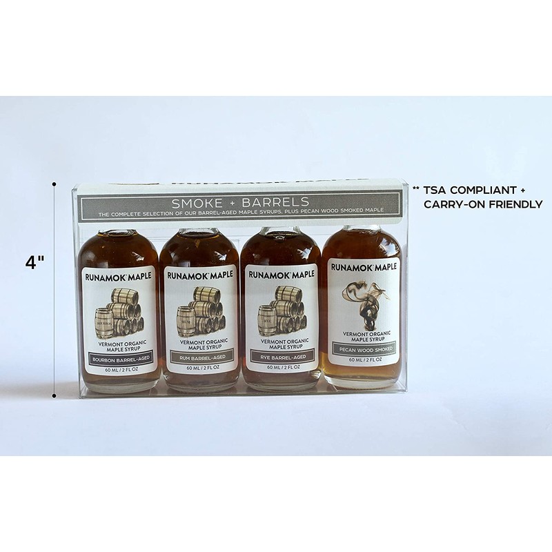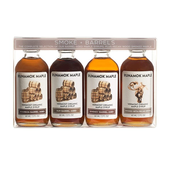 - MAPLE SYRUP SAMPLER: 4 x 2 ounce (60ml) Bottles of Bourbon Barrel-Aged Organic Maple Syrup, Rum Barrel-Aged Organic Maple Syrup, Whiskey Barrel-Aged Organic Maple Syrup and Smoked with Pecan Wood Maple Syrup.
