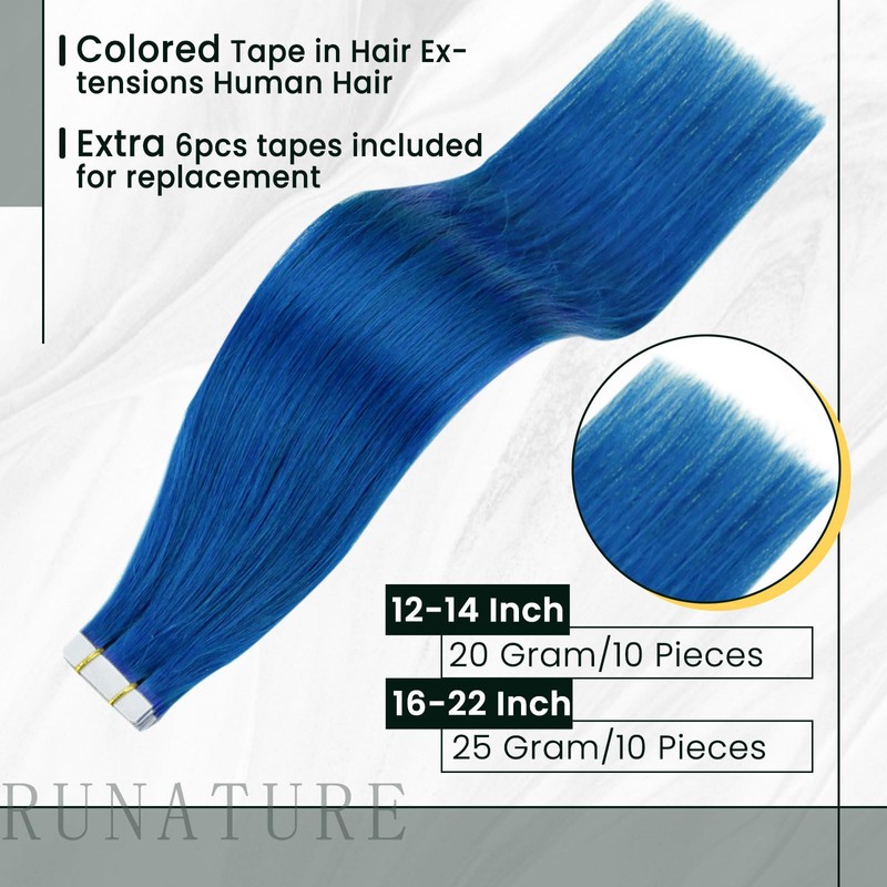 RUNATURE Real Hair Extensions Tape Blue 35 cm Real Hair Pack of 10 Invisible Tape Extensions Real Hair Pink Straight Hair Extensions 20 g Tape in Extensions Real Hair #Blue