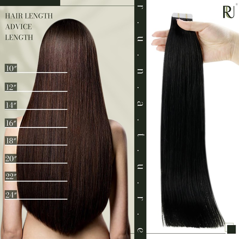 RUNATURE Real Hair Tape-in Jet Black Tape-in Hair Extensions, Real Hair Tape-in Black Hair Extensions, Remy Tape-in Real Hair Extensions, 40 cm / 16 Inches, 20 Pieces, 50 g, #1