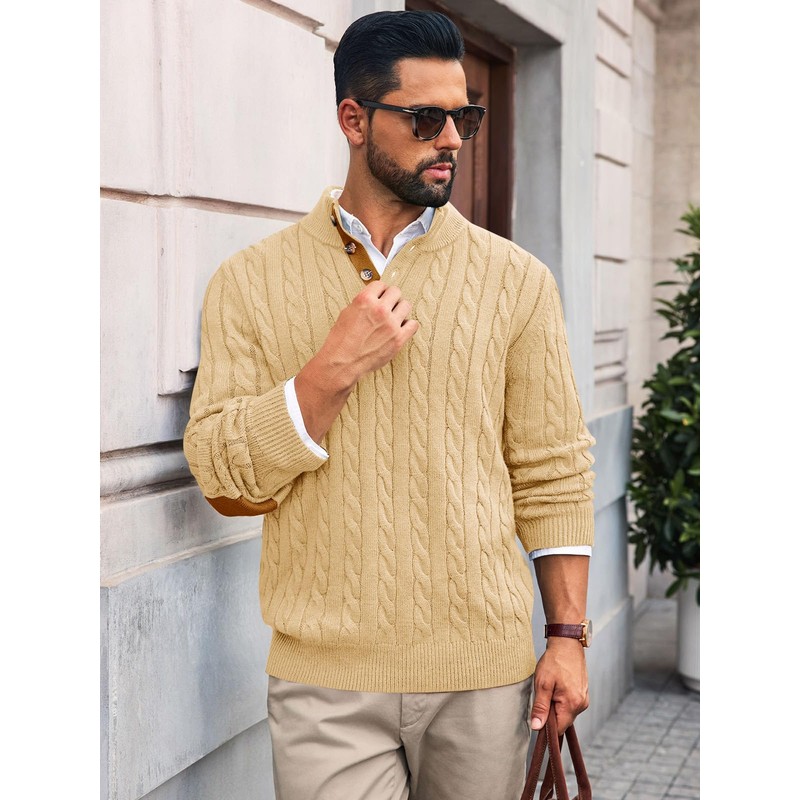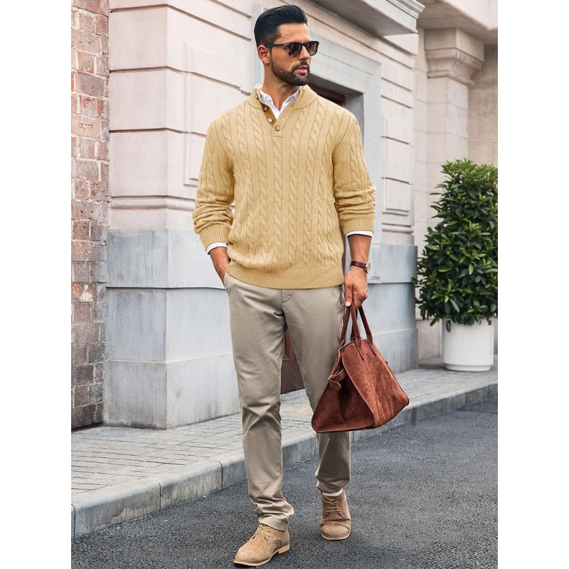 Runcati Mens Cable Knitted Pullover Sweater Casual Stand Collar Winter Warm Quarter Button Sweaters Light Khaki