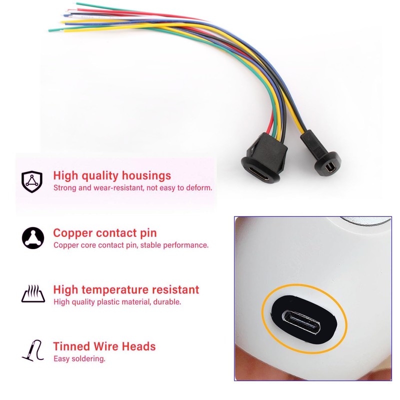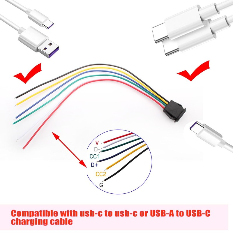 RUNCCI-YUN 6 pieces USB C female 5V 3A 6-pin with snap groove buckle, 6-wire USB C solder mounting socket with PD function, 150 mm 24 AWG wires, black