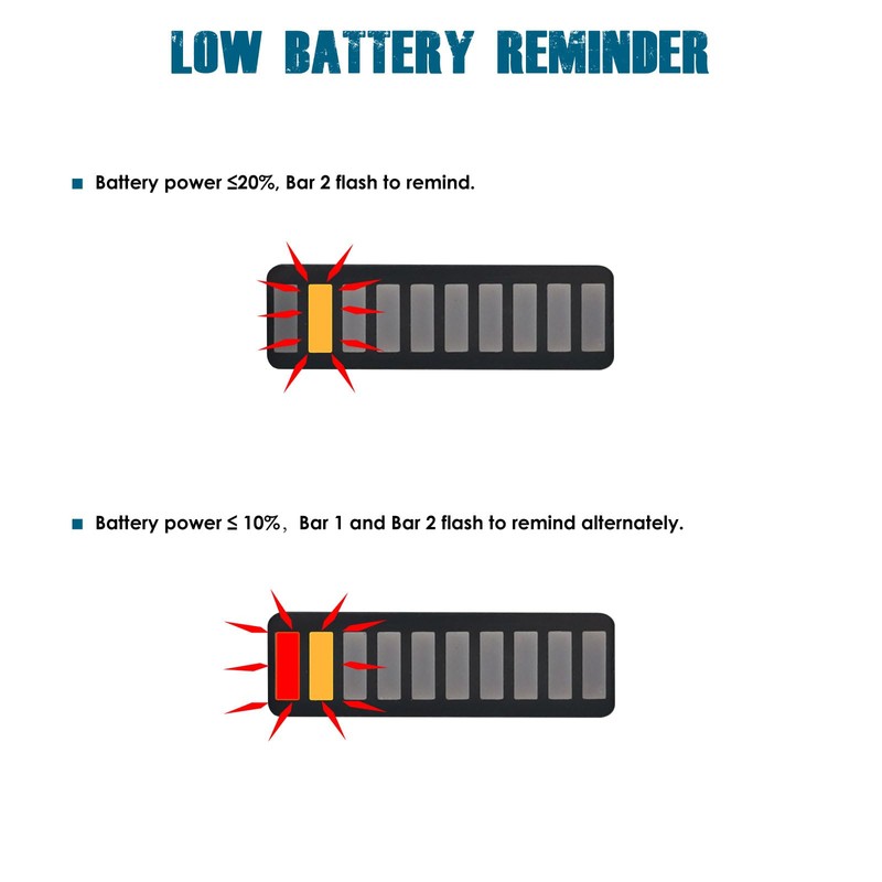 - LOW BATTERY REMINDER ---- It with ability to let you know when to charge the battery,when battery capacity ≤20%, it will remind you by 1 flashing LED bar,when battery capacity≤10%,it will remind you by 2 bars flashing alternately.