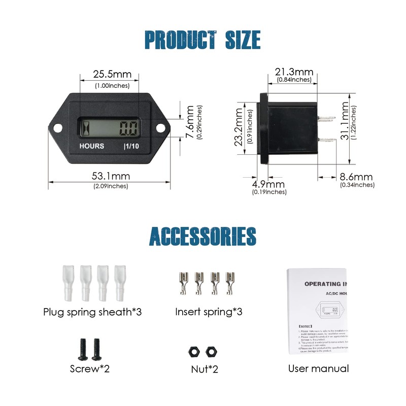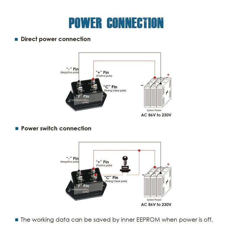 - Installation: easy to assemble by drilling and snapping into any suitable place, panel cut-out size: 36.5 x 24.5 mm (1.5 x 1.0 inches); connect the " + " to " - " to start the hour recording, and reset the running data to " C " - " - " together with the turn on (" + " and " - " - " - ); ); you can have the Programmer PG601 use to change the parameter when "P" is connected.