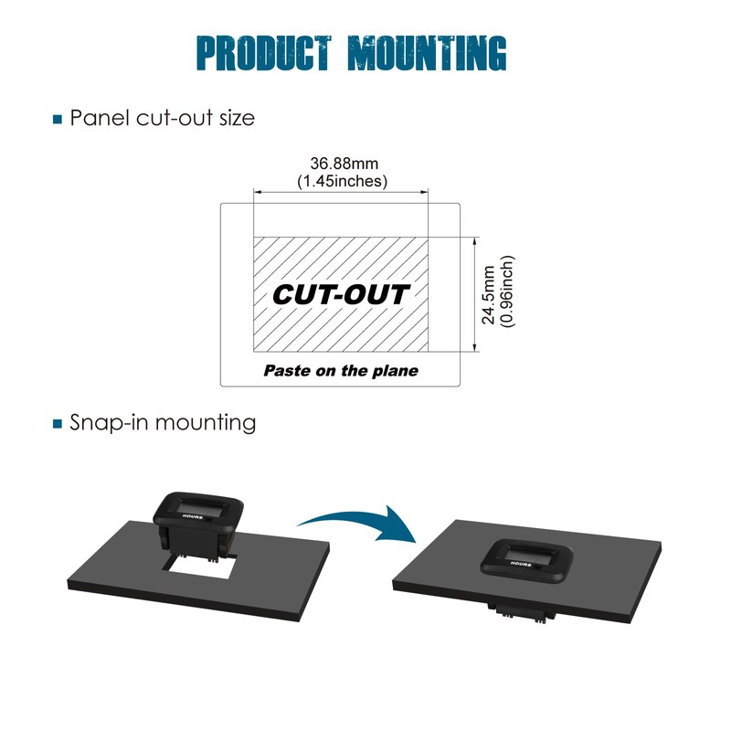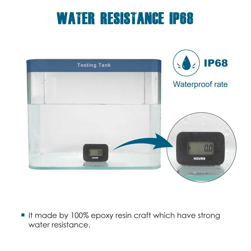 - Waterproof: this operating hour meter is made of 100% epoxy resin, has a strong waterproof rating and usually runs up to 10 metres underwater up to the standard IP68.