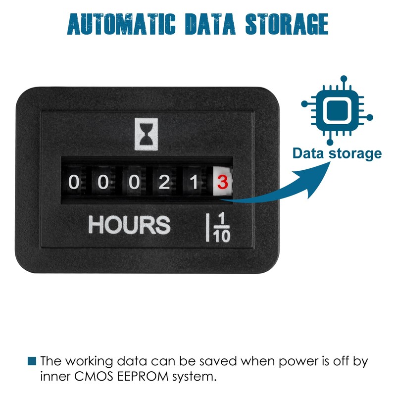 - DATA STORAGE ---- It holds the historic hours value permanently by mechanical design and inner EEPROM system.